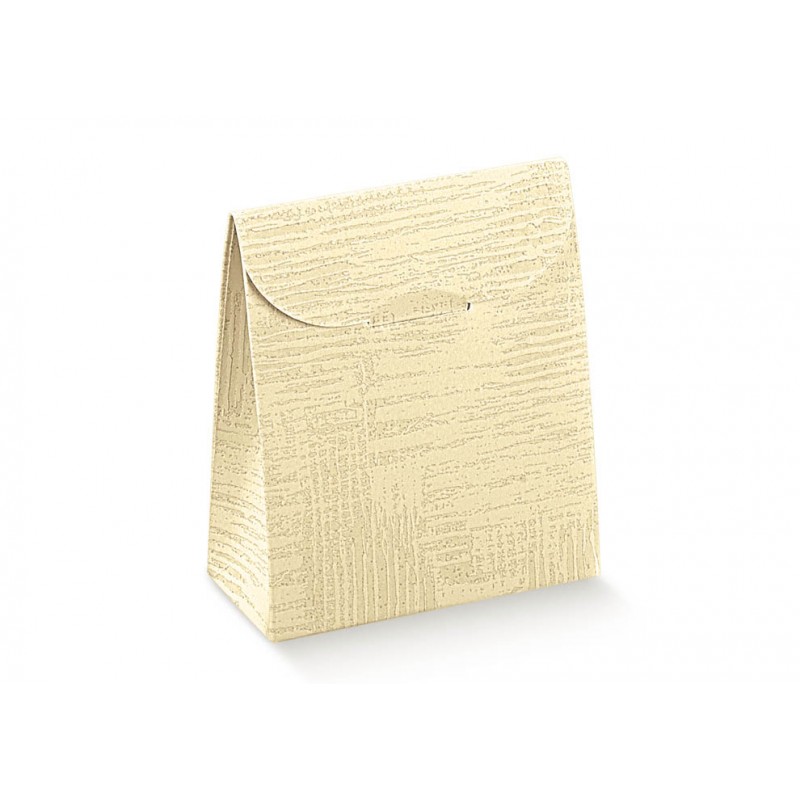 Caja para brinde – Sacchet Tela Neutra Marfil 115x55x180mm con diseño vertical y forma de bolsa. Hecha en cartón microcanal resistente con acabado suave tipo tela marfil. Perfecta para presentar productos con estilo y funcionalidad. Ideal para eventos especiales o promociones.