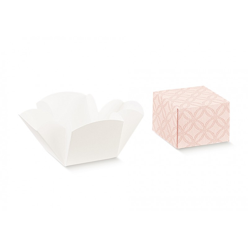 Scatola regalo FLEUR con finitura trapuntata rosa, senza finestra. Dimensioni: 50x50x50mm. Perfetta per bijoux, dolci o bomboniere.
