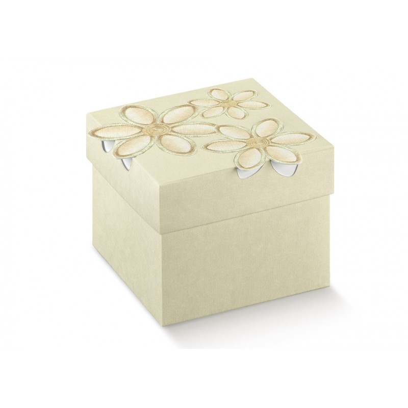 Kwadratowe pudełko z haftowanym kwiatem na wieczku. Idealne na eleganckie upominki.