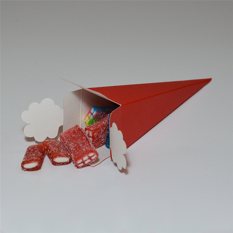 Pudełko prezentowe - Cono Quad. Lino Rosso w kształcie stożka, wykonane z wytrzymałego kartonu. Zamykane za pomocą wstążki (brak w zestawie). Doskonałe na słodycze, upominki lub pamiątki.