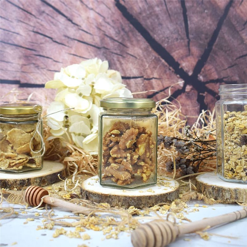 Frascos de mel hexagonais de 270ml com tampas.